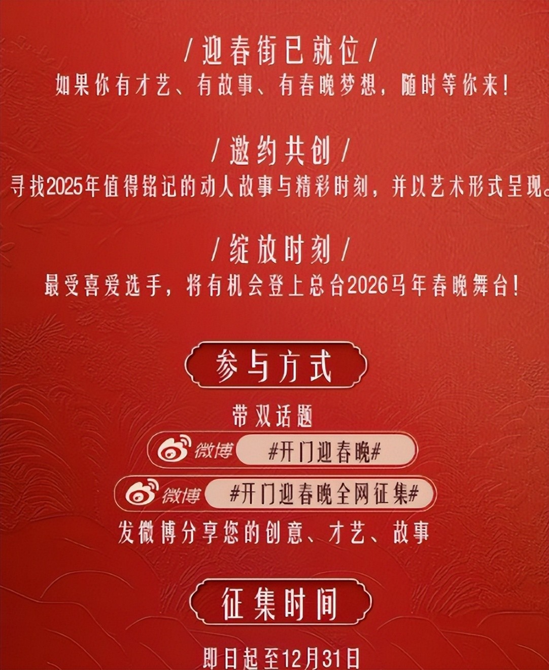 12月3日,央视春晚向全网征集新节目,有才之人皆可报名参赛,提前官宣主要目的是为了征集节目。