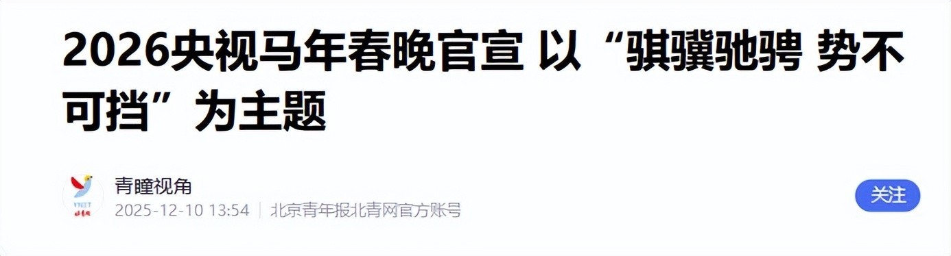 根据官宣物料可以看到,今年春晚主题是“骐骥驰骋,势不可挡”,这句话出自《楚辞·离骚》: